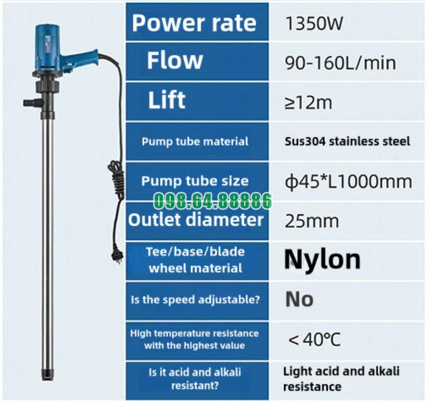 Chi tiết cấu tạo thân máy Bơm điện cầm tay hút thùng phuy JDT-1350W-SUS304N