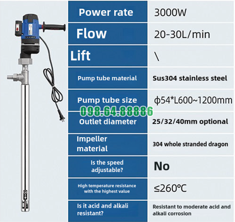 Tóm lại, vai trò của Bơm nhúng thùng phuy JDT-3000W-JLG260 trong việc chiết rót dung môi thể hiện ở khả năng tạo dòng chảy ổn định, tăng độ an toàn, giảm hao hụt và hỗ trợ vận hành hiệu quả trong môi trường công nghiệp. Đây là giải pháp phù hợp cho các doanh nghiệp cần chiết rót dung môi thường xuyên với yêu cầu cao về an toàn, hiệu suất và tính kinh tế.