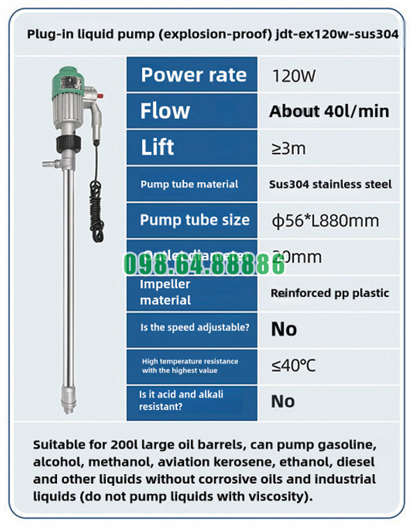 Tại sao nên chọn Bơm chất lỏng cắm điện chống cháy nổ JDT-EX120W-SUS304 thay vì bơm tay? Với lưu lượng khoảng 40 lít/phút, thiết bị giúp sang chiết nhanh chóng, trong khi bơm tay thường chậm và phụ thuộc hoàn toàn vào sức người.