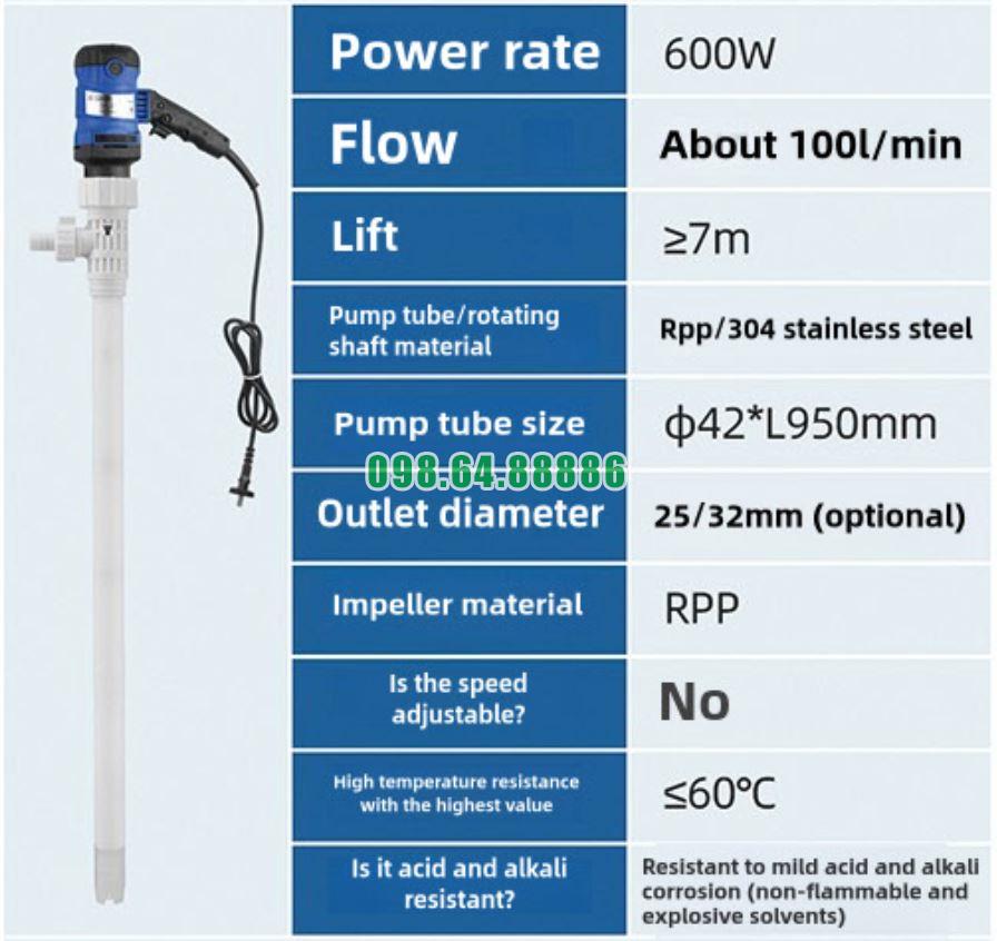 Bơm thùng phuy trục cứng chịu axit nhẹ JDT-600W-RPP