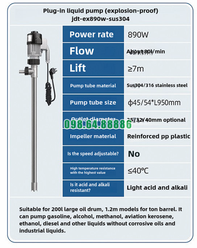 Máy bơm chất lỏng cắm trực tiếp chống cháy nổ JDT-EX890W-SUS304 giúp tiết kiệm thời gian sang chiết