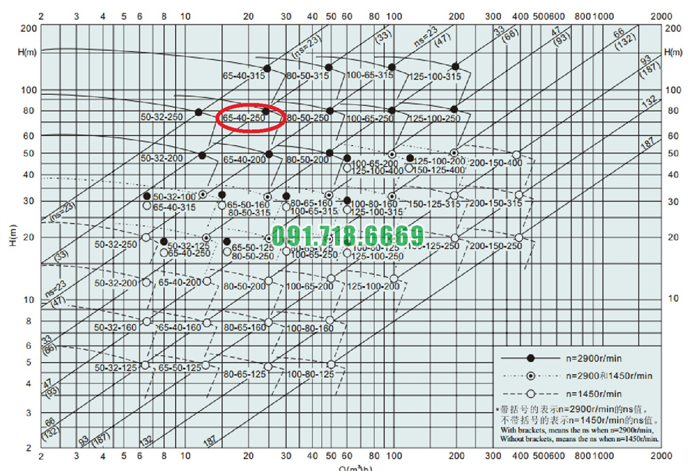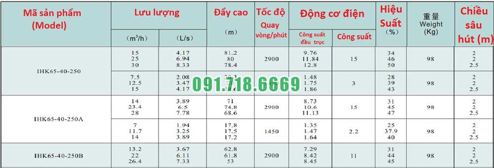 Bảng lưu lượng của máy bơm nước cánh hở IHK65-40-250 vật liệu inox 304