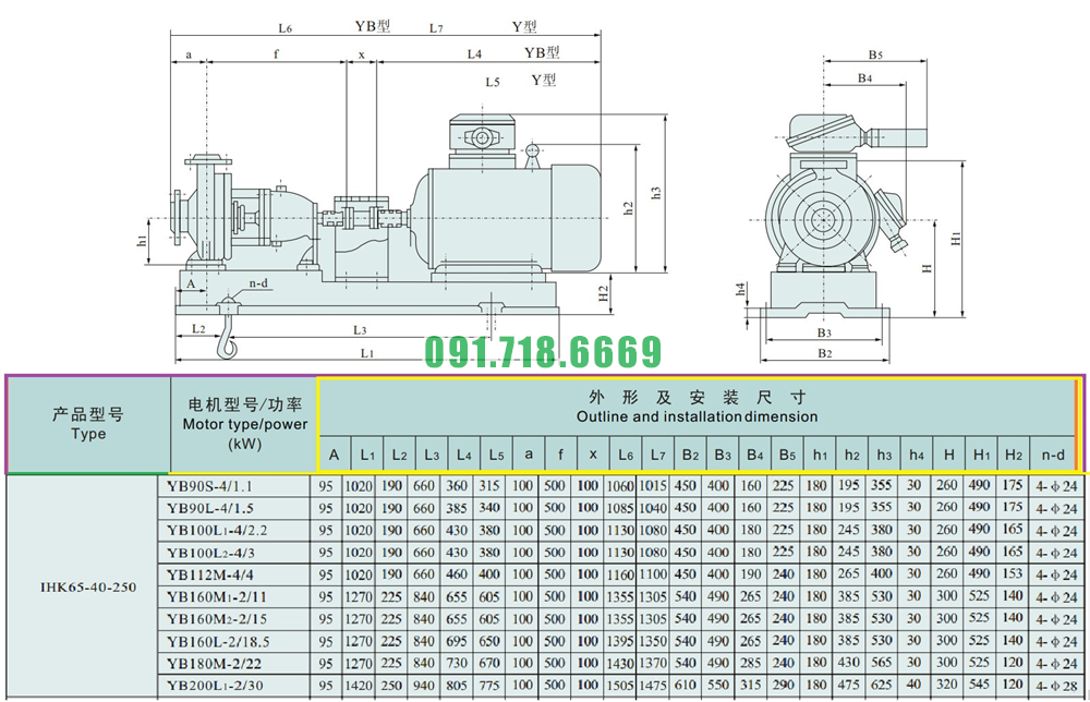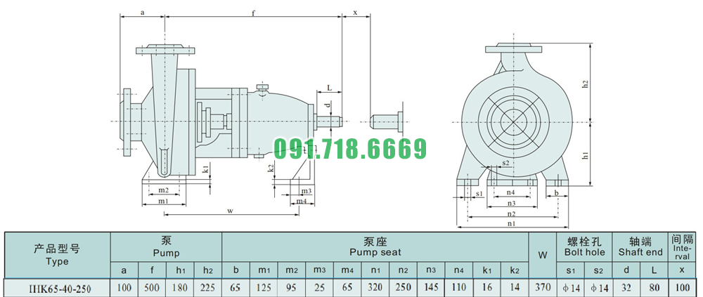 Kích thước của đầu máy bơm nước cánh hở IHK65-40-250 vật liệu inox 304
