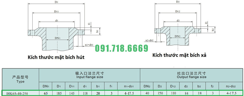 Kích thước mặt bích của máy bơm nước cánh hở IHK65-40-250 vật liệu inox 304
