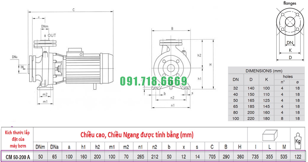 Kích thước hiệu suất máy bơm nước li tâm CM50-250C hiệu suất 78 m3/h