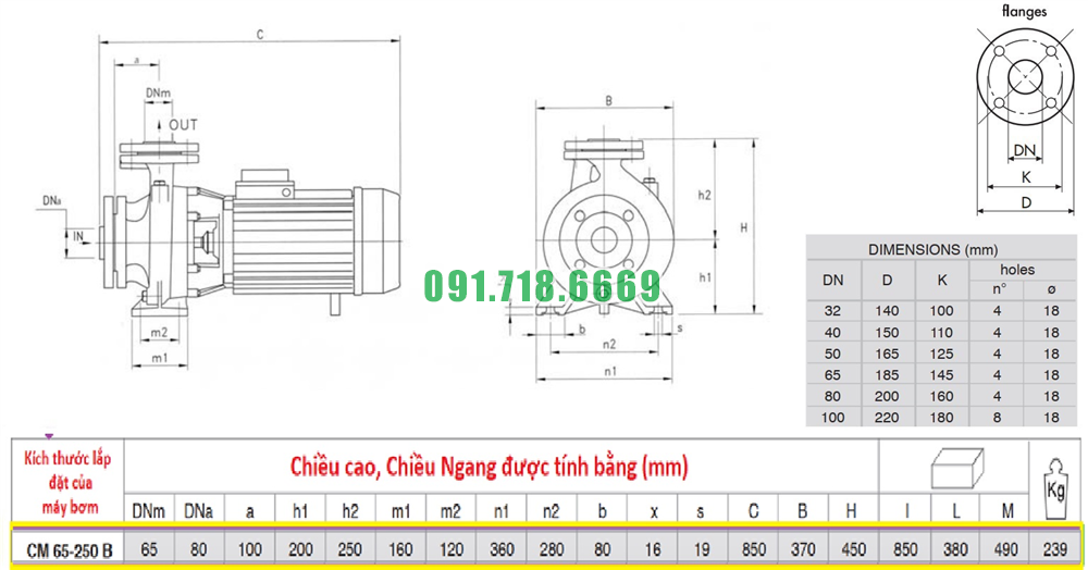 Kích thước máy bơm nước li tâm CM65-250B vật liệu gang FC200