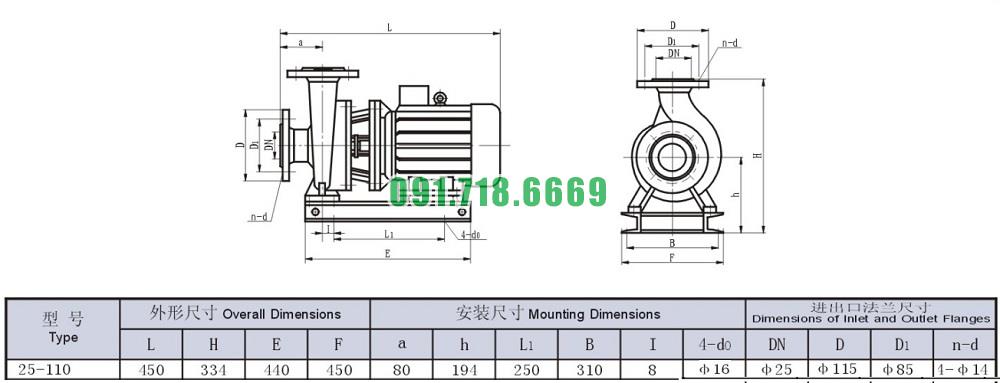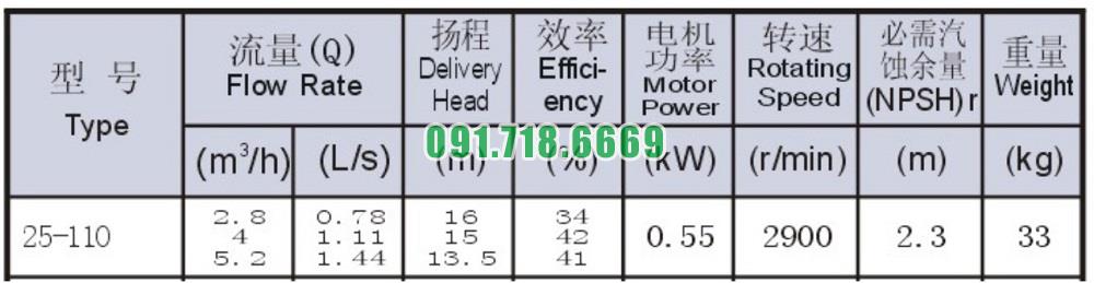 Bơm li tâm trục ngang ISW25-110 lưu lượng 1.44 L/s hoặc 5.2 m3/h