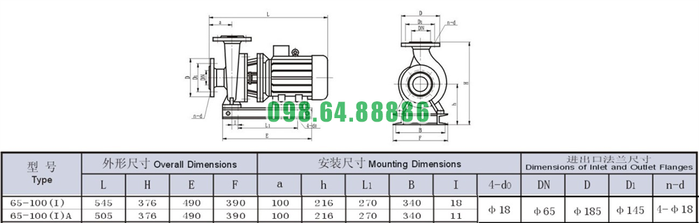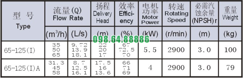 Bảng thông số kỹ thuật bơm li tâm trục ngang mode SLW65-ISW65-125-I