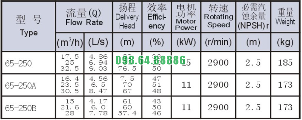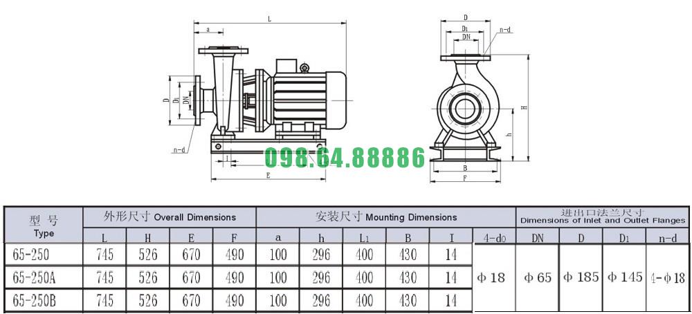 Bảng thông số kỹ thuật bơm li tâm trục ngang mode SLW65-ISW65-250
