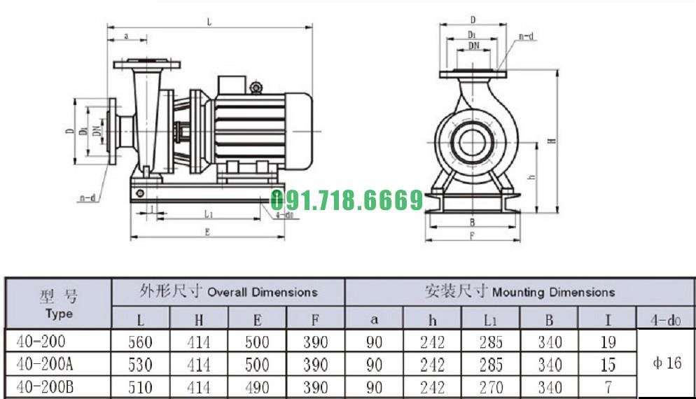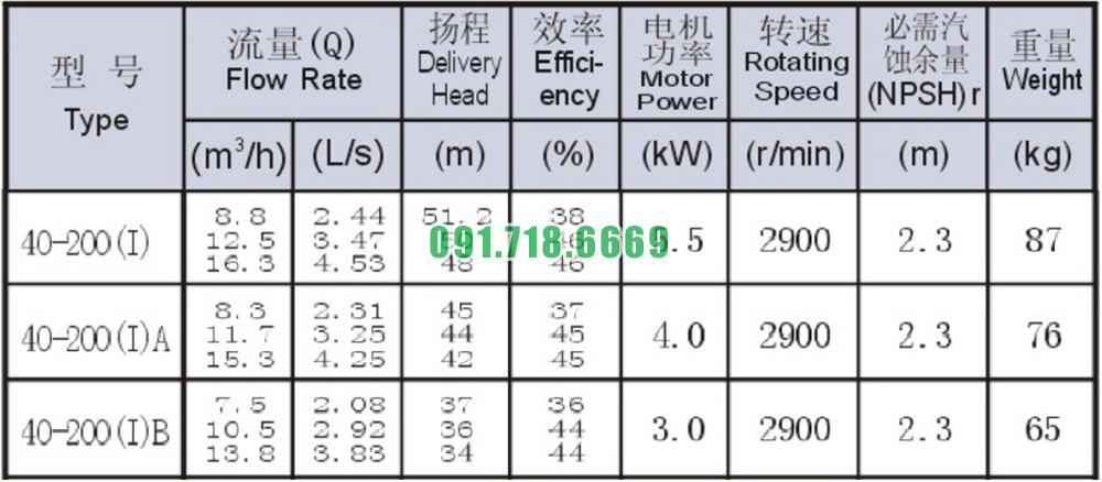 Bảng thông số kỹ thuật bơm li tâm trục ngang SLW-ISW40-200-I