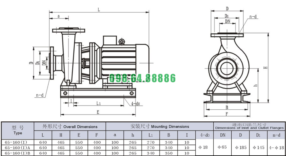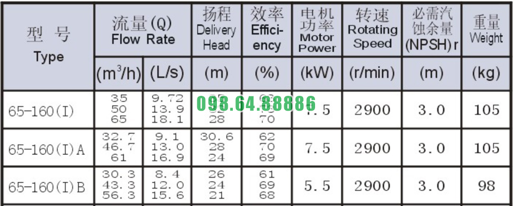 Bảng thông số kỹ thuật bơm li tâm trục ngang SLW65-ISW65-160-I