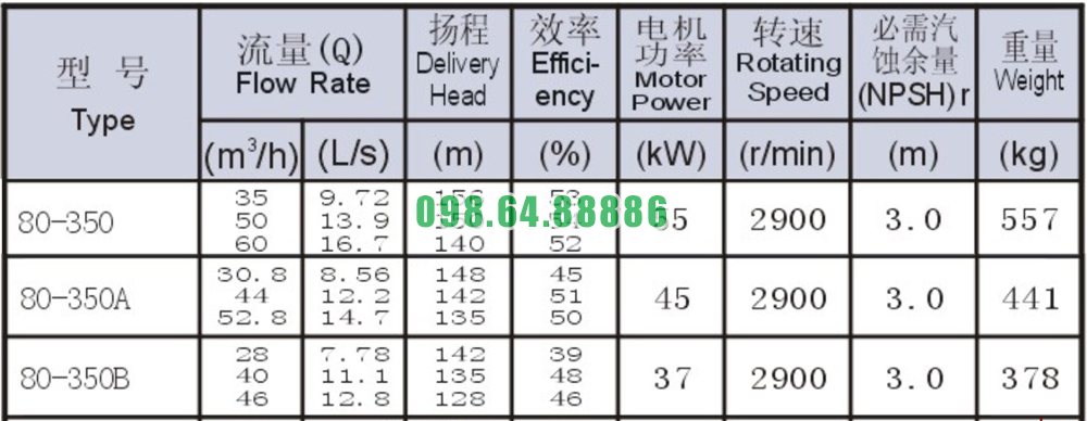 Bảng thông số kỹ thuật bơm li tâm trục ngang SLW80-ISW80-350
