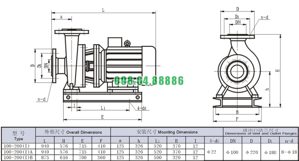 Bản vẽ cấu tạo và kích thước bơm nước nằm ngang mã SLW100-ISW100-200-I động cơ 37 kw