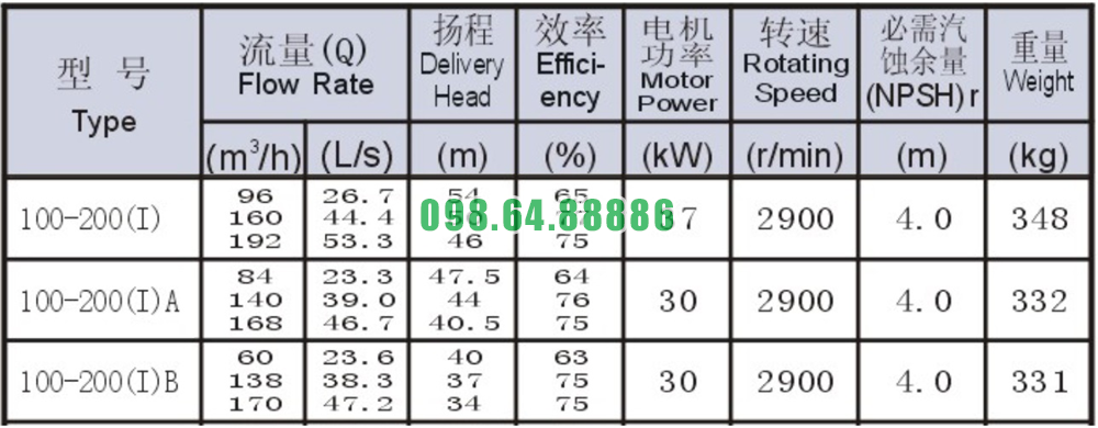 Bảng thông số kỹ thuật bơm nước nằm ngang mã SLW100-ISW100-200-I động cơ 37 kw