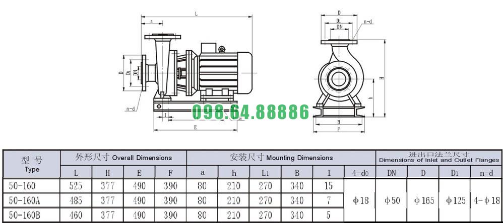 Bản vẽ cấu tạo và kích thước bơm nước nằm ngang SLW-ISW50-160 năng suất từ 45% - 52%