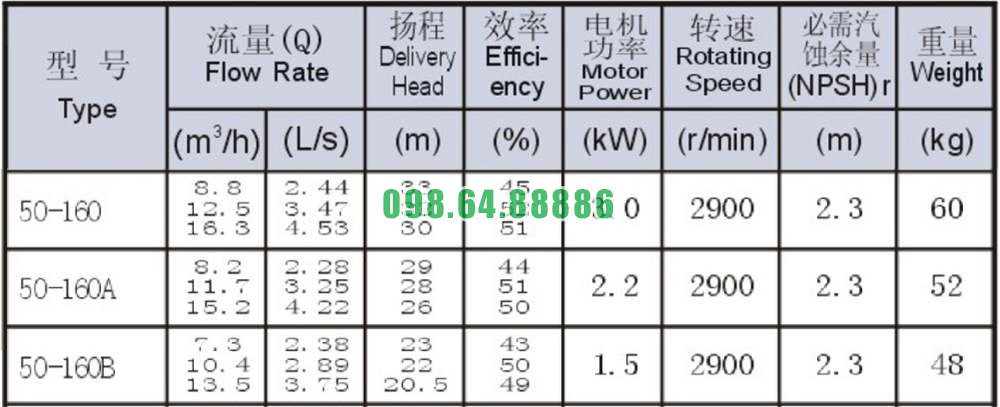 Bảng thông số kỹ thuật bơm nước nằm ngang SLW-ISW50-160 năng suất từ 45% - 52%