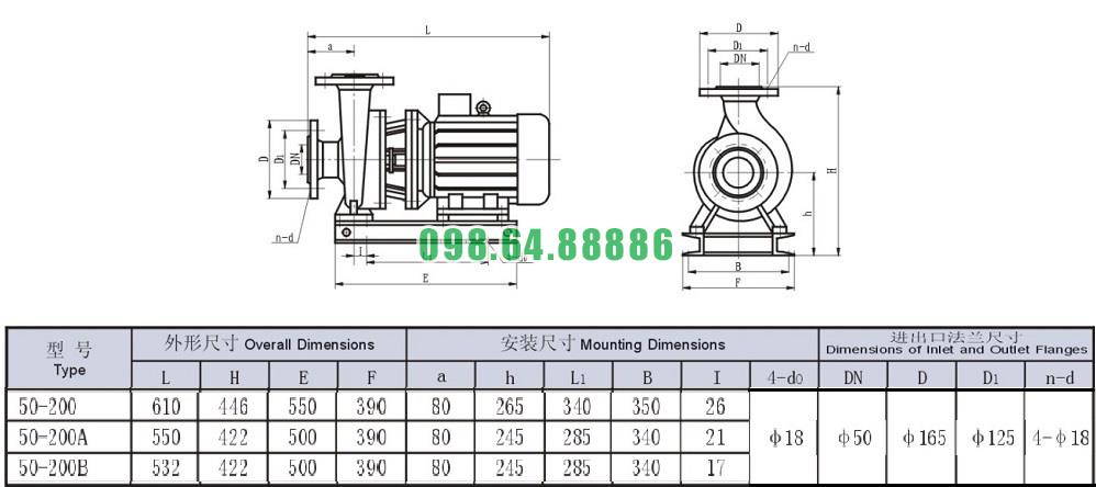 Bản vẽ cấu tạo và kích thước bơm nước nằm ngang SLW-ISW50-200 độ hút sâu 2.3m