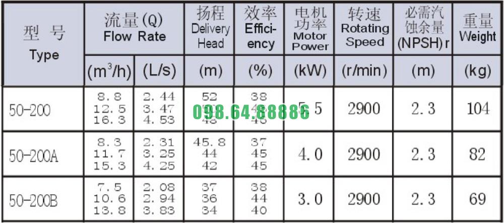 Bảng thông số kỹ thuật bơm nước nằm ngang SLW-ISW50-200 độ hút sâu 2.3m