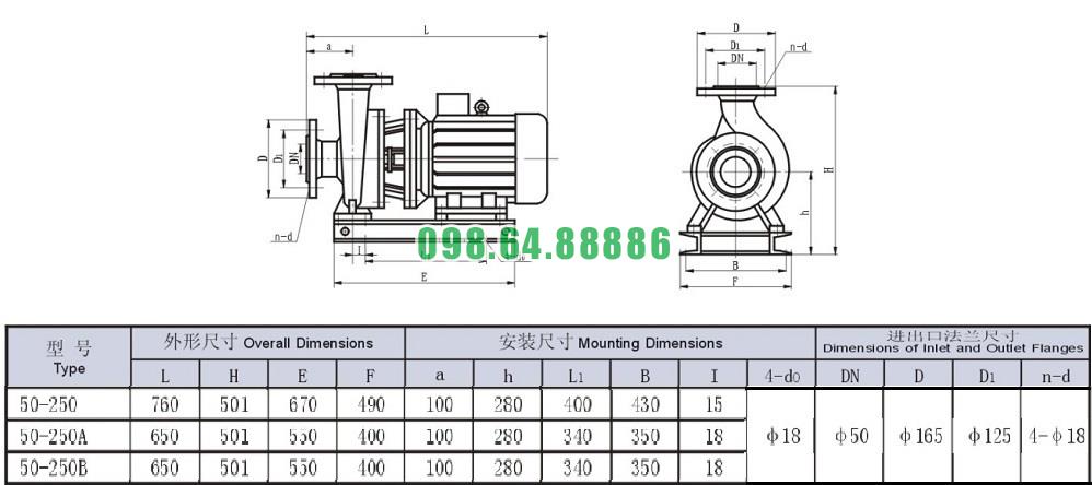 Bản vẽ cấu tạo và kích thước bơm nước nằm ngang SLW-ISW50-250 đẩy cao từ 77.5m- 82m