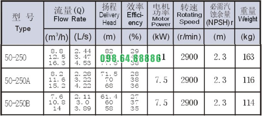 Bảng thông số kỹ thuật bơm nước nằm ngang SLW-ISW50-250 đẩy cao từ 77.5m- 82m