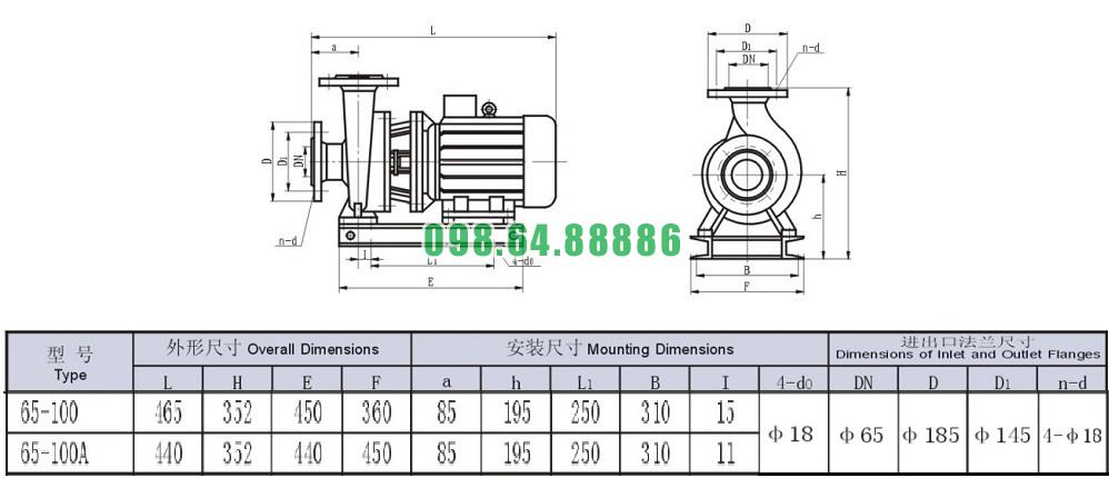 Bản vẽ cấu tạo và kích thước bơm nước nằm ngang SLW-ISW65-100 lưu lượng từ 4.86 L/s - 9.03 L/s