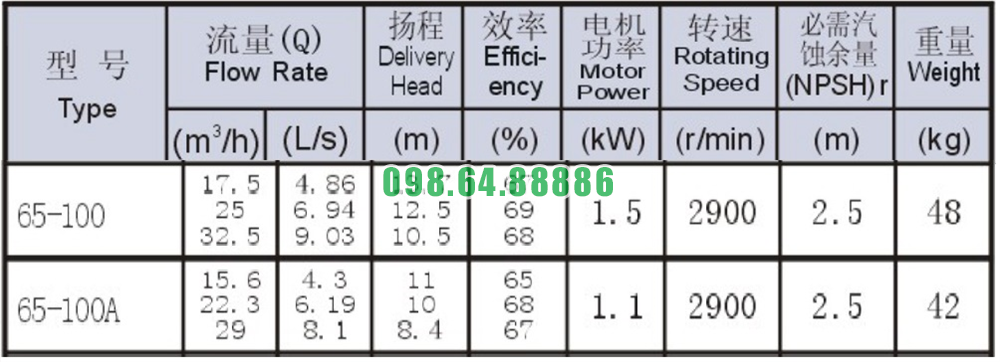 Bảng thông số kỹ thuật bơm nước nằm ngang SLW-ISW65-100 lưu lượng từ 4.86 L/s - 9.03 L/s