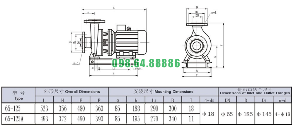 Bản vẽ cấu tạo và kích thước bơm nước nằm ngang SLW-ISW65-125 độ hút sâu 2.5m