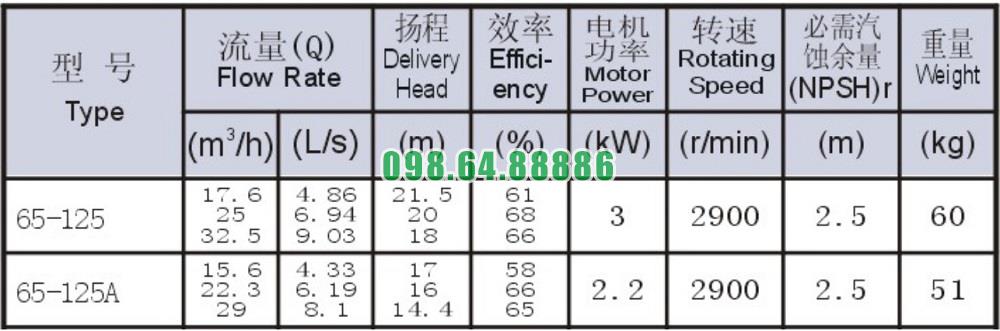 Bảng thông số kỹ thuật bơm nước nằm ngang SLW-ISW65-125 độ hút sâu 2.5m