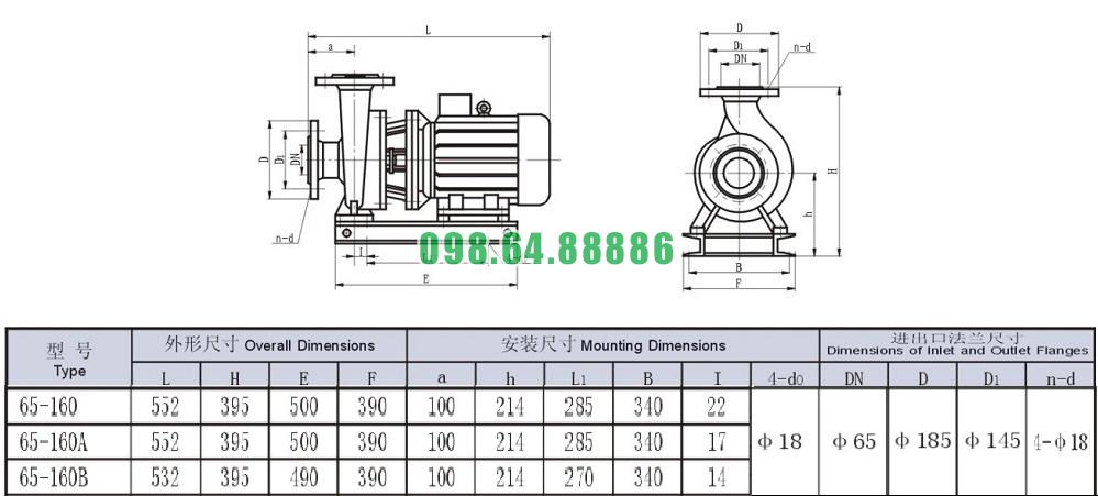 Bản vẽ cấu tạo và kích thước bơm nước nằm ngang SLW-ISW65-160 lưu lượng từ 4.86 L/s - 9.03 L/s
