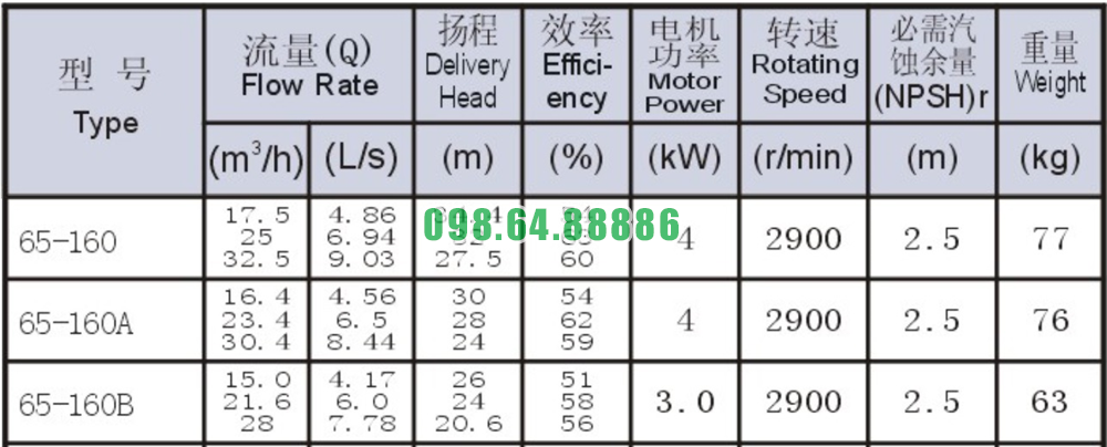 Bảng thông số kỹ thuật bơm nước nằm ngang SLW-ISW65-160 lưu lượng từ 4.86 L/s - 9.03 L/s