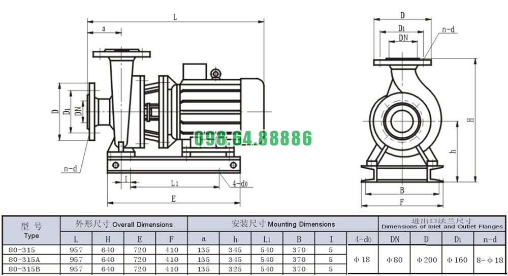 Bản vẽ cấu tạo và kích thước bơm nước nằm ngang SLW80-ISW80-315 đẩy cao từ 122m- 128m
