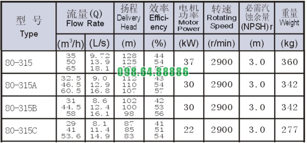 Bảng thông số kỹ thuật bơm nước nằm ngang SLW80-ISW80-315 đẩy cao từ 122m- 128m