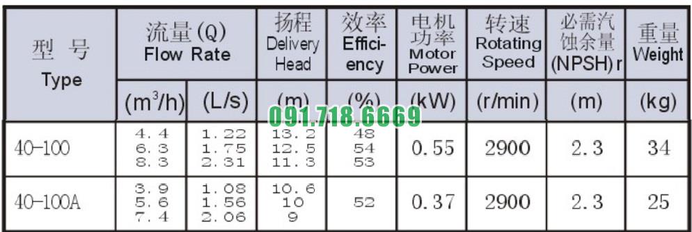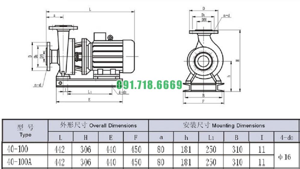 Bản vẽ cấu tạo và kích thước bơm nước trục ngang SLW-ISW40-100 đẩy cao max 13.2m