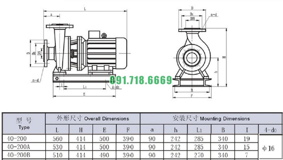 Bản vẽ cấu tạo và kích thước bơm nước trục ngang SLW-ISW40-200 đẩy cao max 51m