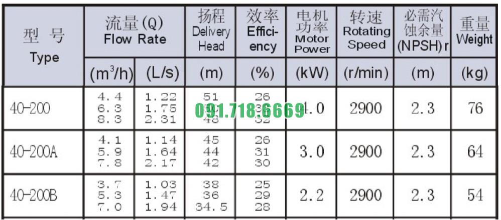 Bảng thông số kỹ thuật bơm nước trục ngang SLW-ISW40-200 đẩy cao max 51m