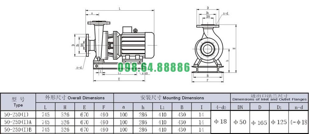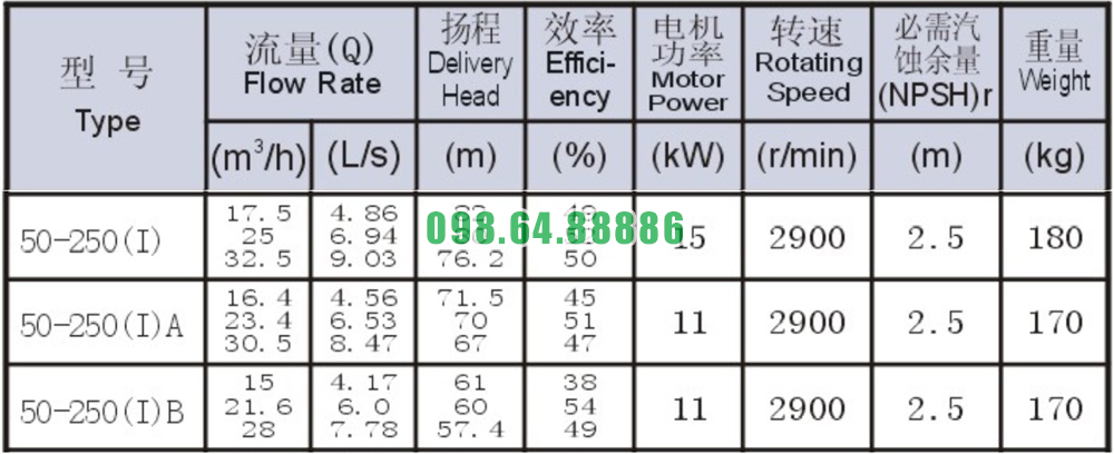 Bảng thông số kỹ thuật bơm nước trục ngang SLW-ISW50-250-I