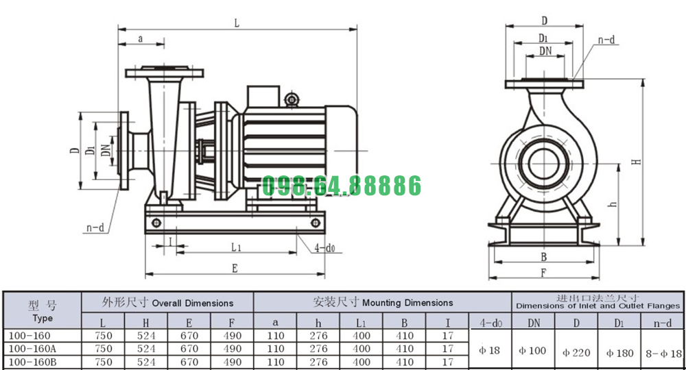 Bản vẽ cấu tạo và kích thước bơm nước trục ngang SLW100-ISW100-160 hút sâu 4.5m