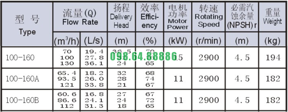 Bảng thông số kỹ thuật bơm nước trục ngang SLW100-ISW100-160 hút sâu 4.5m