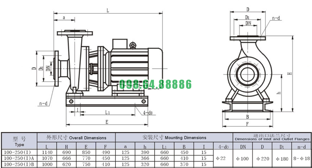 Bản vẽ cấu tạo và kích thước bơm nước trục ngang SLW100-ISW100-250-I hiệu năng 77%
