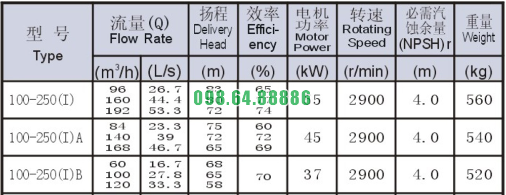 Bảng thông số kỹ thuật bơm nước trục ngang SLW100-ISW100-250-I hiệu năng 77%