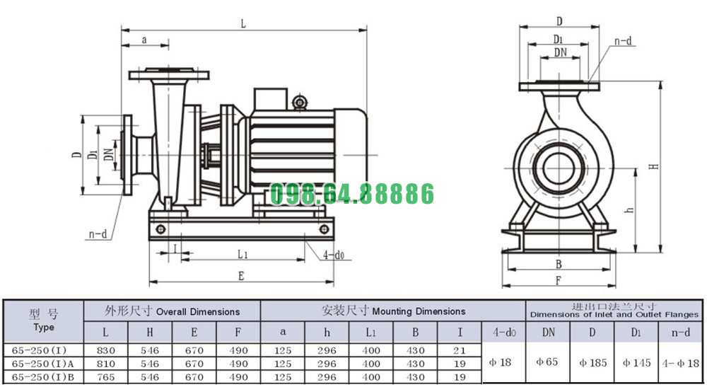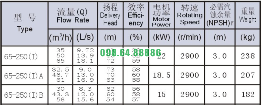 Bảng thông số kỹ thuật bơm nước trục ngang SLW65-ISW65-250-I lưu lượng 18.1 L/s
