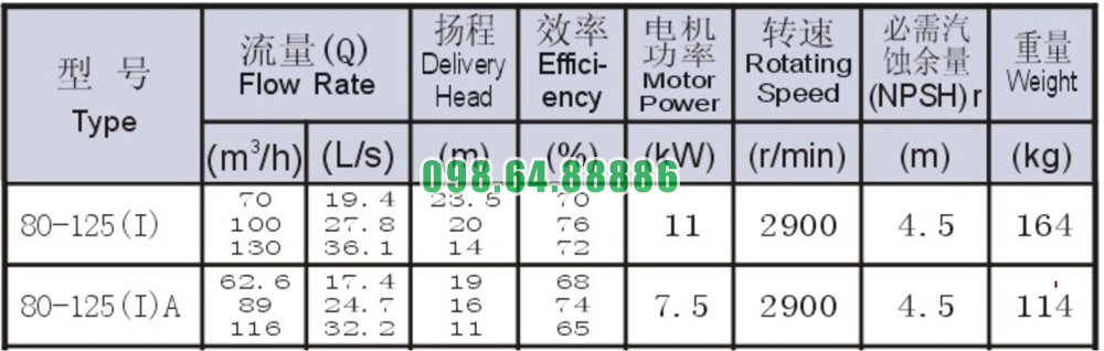 Bảng thông số kỹ thuật bơm nước trục ngang SLW80-ISW80-125-I đẩy cao max 23.5m