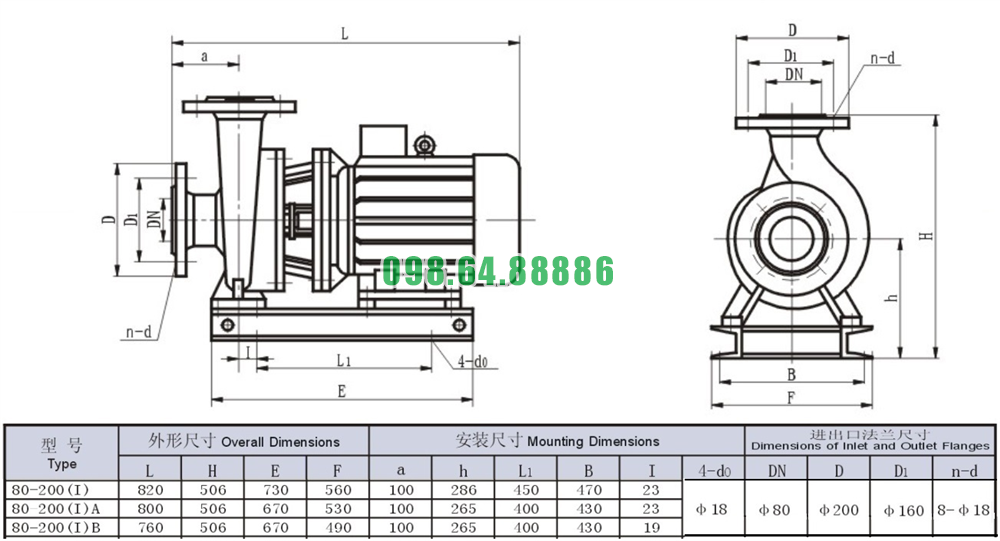 Bản vẽ cấu tạo và kích thước bơm nước trục ngang SLW80-ISW80-200-I đẩy cao max 36.5m