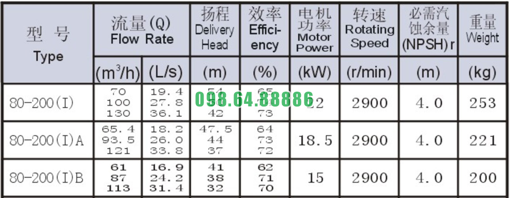Bảng thông số kỹ thuật bơm nước trục ngang SLW80-ISW80-200-I đẩy cao max 36.5m