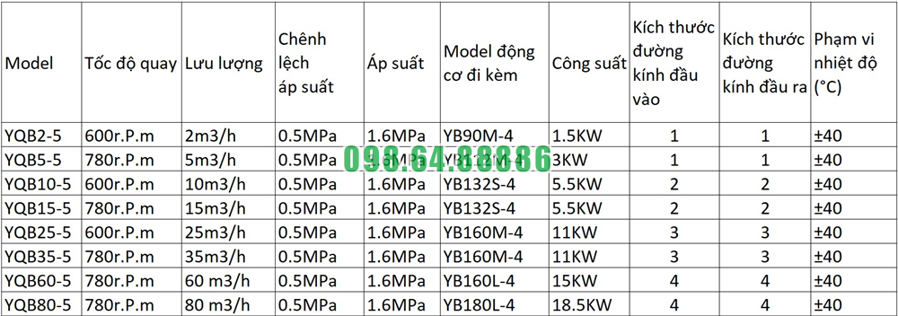 Bảng thông số kỹ thuật của Bơm khí hóa lỏng loại YQB