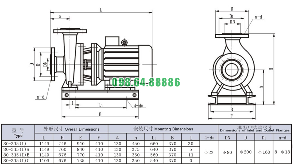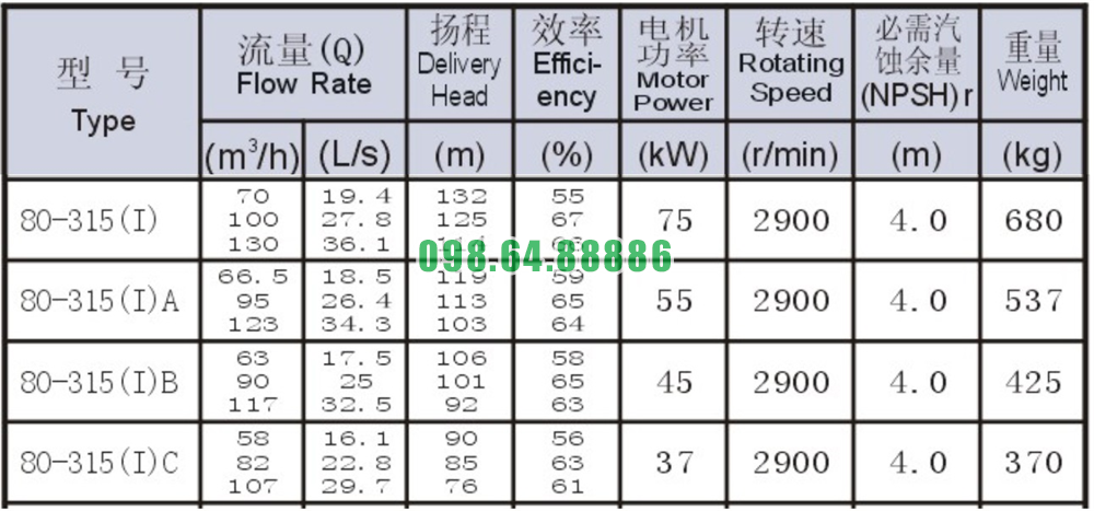 Bảng thông số kỹ thuật bơm nước trục ngang model SLW80-ISW80-315-I công suất 75 kw đẩy cao 132m