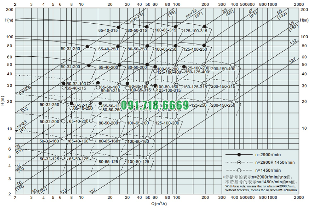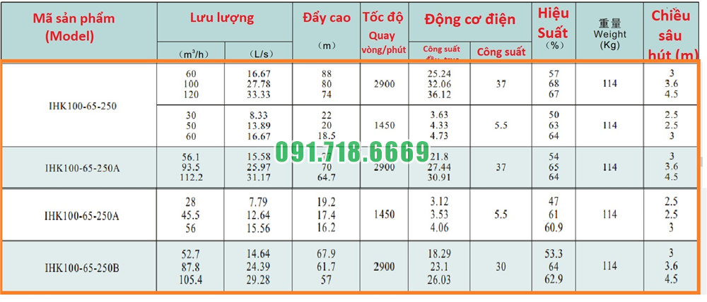 Bảng lưu lượng của máy bơm nước sạch cánh hở IHK100-65-250 đường thoát 65 mm