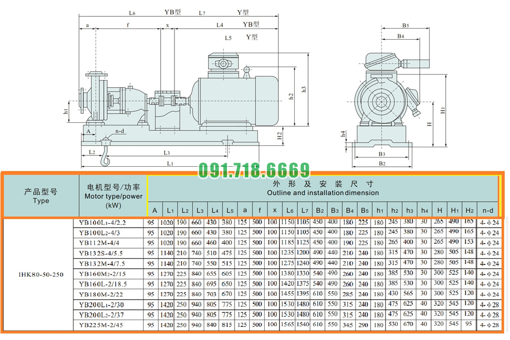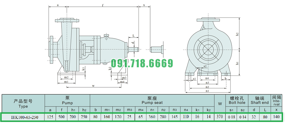 Kích thước của đầu máy bơm nước sạch cánh hở IHK100-65-250 đường thoát 65 mm
