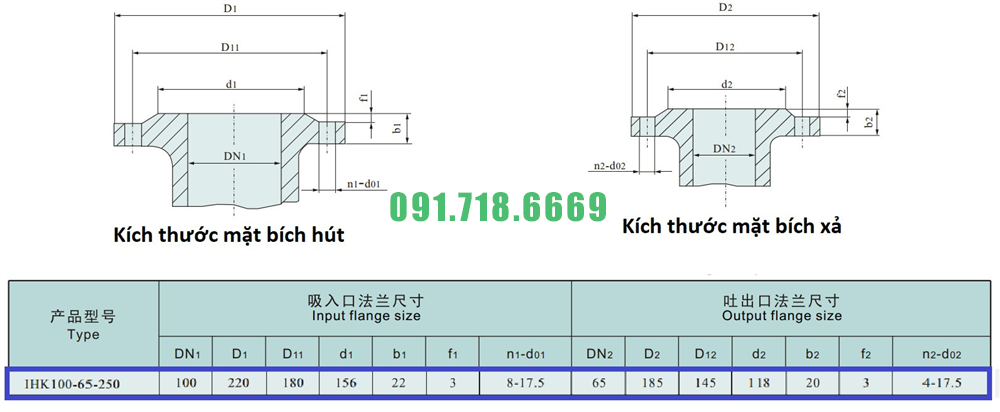 Kích thước mặt bích của máy bơm nước sạch cánh hở IHK100-65-250 đường thoát 65 mm