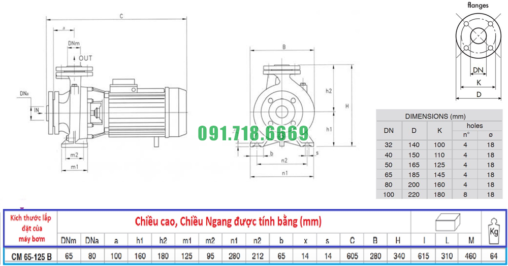 Kích thước máy bơm nước sạch li tâm CM65-125B kích thước Dn65